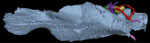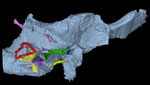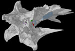 Click on the thumbnail to the left for a yaw animation (11.6 mb) of the Alioramus cranial endocast and sinus cavernosus within the braincase, which is rendered semi-transparent. |