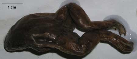 Xenopus laevis, the African clawed frog, derives its name from the keratinous claws that cover its medial toes and its geographic range, which covers much of southern Africa. Xenopus is highly aquatic and bears several adaptations for this environment, including a dorsoventrally flattened body, dorsally directed eyes, the presence of a lateral line system throughout life, and large muscular hindlimbs. These frogs are especially bizarre considering that they lack tongues, vocal sacs, and vocal chords (Cannatella and De Sa, 1993).